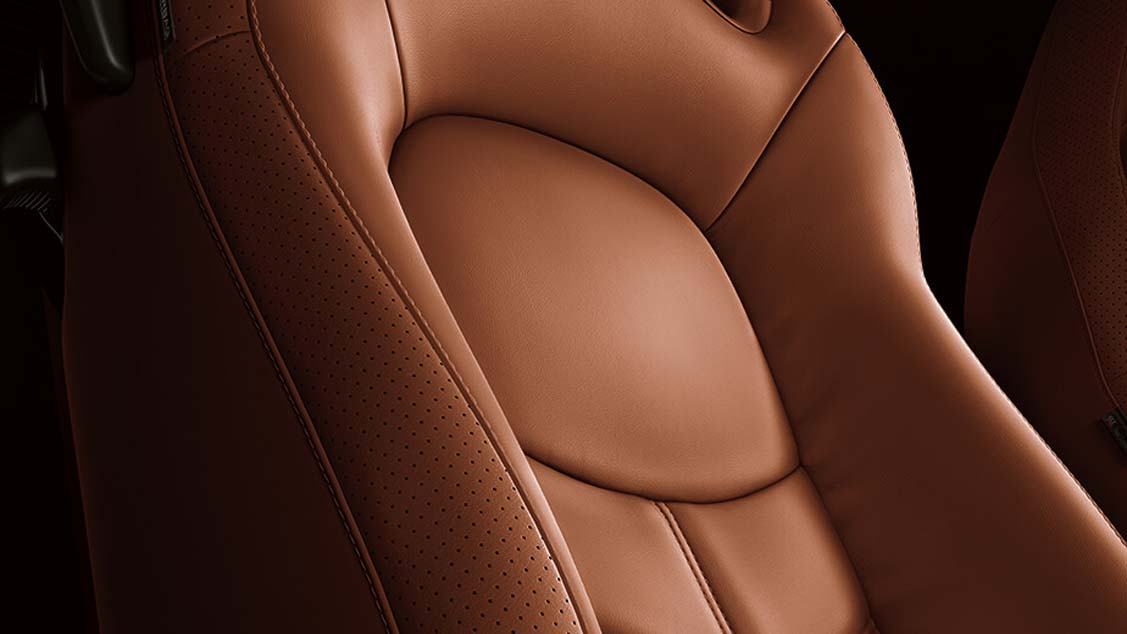 - Semi-aniline leather accented^ seats in your choice of amber red, ivory, tan or samurai black